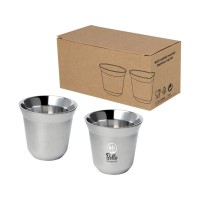 Набор из 2 чашек для эспрессо из нержавеющей стали, сертифицированной RCS, с двойными стенками. Объем — 80 мл. Поставляется в подарочной коробке из переработанного картона. 91% RCS certified recycled stainless steel.