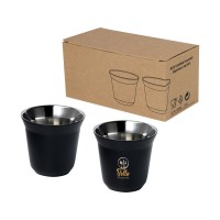 Набор из 2 чашек для эспрессо из нержавеющей стали, сертифицированной RCS, с двойными стенками. Объем — 80 мл. Поставляется в подарочной коробке из переработанного картона. 91% RCS certified recycled stainless steel.