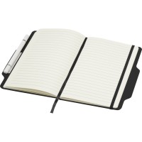 Блокнот Nexus формата A5 в твердой обложке с ручкой/карандашом, с 80 кремовыми линованными листами бумаги плотностью 70 г/м?, с закругленными углами, эластичной застежкой и ленточным маркером. Ручка двухсторонняя: одна сторона — ручка с черными чернилами, а другая — карандаш. Длина непрерывной линии ручки: 1000 метров. Размер пера: 1,00 ММ. FSC certified paper, PU Plastic.