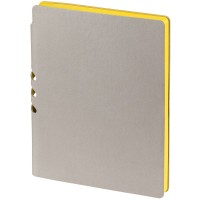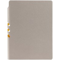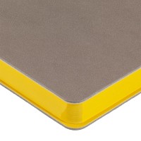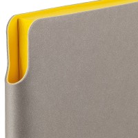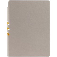 Гибкая обложка выполнена из материала Velour Melange, серый СС и Latte, желтый КК (внутренняя часть обложки). Внутри корешка — специальное место для крепления ручки размером до 15х0,9 см.