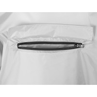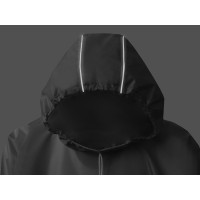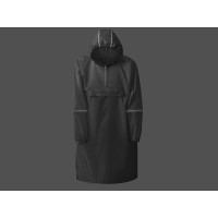 Дождевик - пончо прямого силуэта. Нагрудный карман плаща закрывается на молнию, которая дополнительно защищена клапаном, а еще в него можно полностью убрать дождевик. На дне кармана — ручка-петелька, которая в сложенном виде может использоваться для подвешивания.Швы капюшона и рукавов отделаны светоотражающим кантом, который делает человека заметным даже в темное время суток. Для комфортной посадки — затягивающийся на шнурок капюшон с фиксатором и манжеты на резинке.
