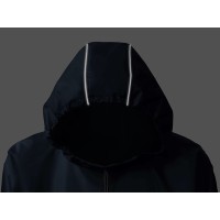 Дождевик - пончо прямого силуэта. Нагрудный карман плаща закрывается на молнию, которая дополнительно защищена клапаном, а еще в него можно полностью убрать дождевик. На дне кармана — ручка-петелька, которая в сложенном виде может использоваться для подвешивания.Швы капюшона и рукавов отделаны светоотражающим кантом, который делает человека заметным даже в темное время суток. Для комфортной посадки — затягивающийся на шнурок капюшон с фиксатором и манжеты на резинке.