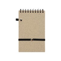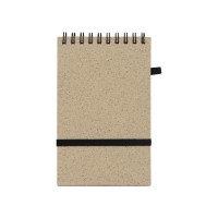 Блокнот с обложкой из переработанной пшеницы и пластика. Блок состоит из 60 листов переработанной бумаги белого цвета. Крепление - пружина. Дополнен петлей для ручки и горизонтальной резинкой.