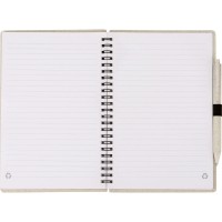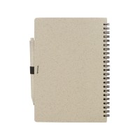 Блокнот с обложкой из переработанной пшеницы и пластика. Блок состоит из 80 листов переработанной бумаги белого цвета. Крепление - пружина. В комплекте шариковая ручка в тон блокноту из пшеничной соломы.