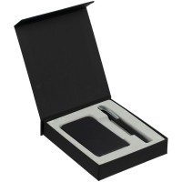 Подарочная коробка для аккумулятора 12,3х7,1х1 см и ручки 14,5х1,5х0,8 см с крышкой на магните и флокированным ложементом. Коробка выполнена из переплетного картона, кашированного дизайнерской софт-тач бумагой Senzo.