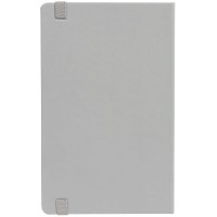 Блокнот в твердой обложке, выполнен из материала Soft Touch, серый СС, дополнен резинкой и ляссе в цвет обложки.