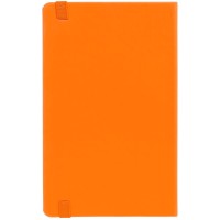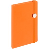 Блокнот в твердой обложке, выполнен из материала Soft Touch, оранжевый ОО, дополнен резинкой и ляссе в цвет обложки.