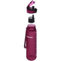 Матовое бархатистое покрытие бутылки приятно на ощупь, широкий ремешок дополнительно фиксирует бутылку во время использования, защитный колпачок не даст воде пролиться в сумке.