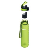 Матовое бархатистое покрытие бутылки приятно на ощупь, широкий ремешок дополнительно фиксирует бутылку во время использования, защитный колпачок не даст воде пролиться в сумке.