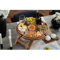 Ножки столика складываются — в сложенном виде его удобно брать с собой и на природу. Бутылка и бокалы надежно фиксируются на подносе, а сам стол, выполненный из натурального дерева, очень крепок и устойчив. Столик рассчитан на 3 бокала и бутылку. Поставляется в индивидуальной транспортной коробке. Для продления срока службы время от времени рекомендуется протирать изделие льняным или минеральным маслом.