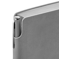Гибкая обложка ежедневника выполнена из материала Latte, серый СС. Внутри корешка — специальное место для крепления ручки размером до 15х0,9 см.