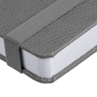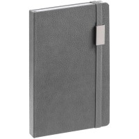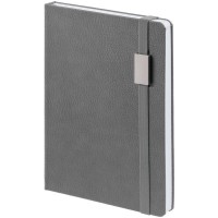 Ежедневник с твердой обложкой, выполнен из материала LaFite, серый СС, дополнен резинкой с металлическим прямоугольным шильдом и ляссе в цвет обложки.