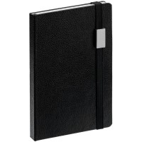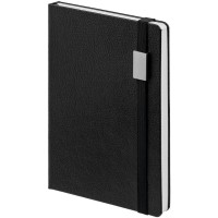 Ежедневник с твердой обложкой, выполнен из материала LaFite, черный АА, дополнен резинкой с металлическим прямоугольным шильдом и ляссе в цвет обложки.