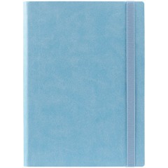 Ежедневник с гибкой обложкой выполнен из материала Latte, голубой JJ, и дополнен резинкой шириной 1 см, капталом и ляссе голубого цвета.