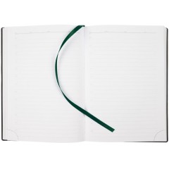 Ежедневник с гибкой обложкой, выполнен из материала Latte, зеленый FF, дополнен резинкой шириной 1 см с металлическим шильдом, капталом и ляссе зеленого цвета.