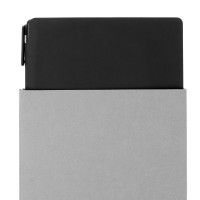 Удобный ежедневник с гибкой обложкой и местом под ручку в корешке, миниатюрная ручка из переработанного пластика и компактная самосборная коробка — простые составляющие полезного делового набора.