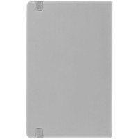 Блокнот в твердой обложке, выполнен из материала Soft Touch, серый СС, дополнен резинкой и ляссе в цвет обложки.