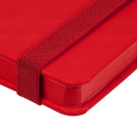 Блокнот в твердой обложке, выполнен из материала Soft Touch Ultra, красный РР, дополнен резинкой и ляссе в цвет обложки.