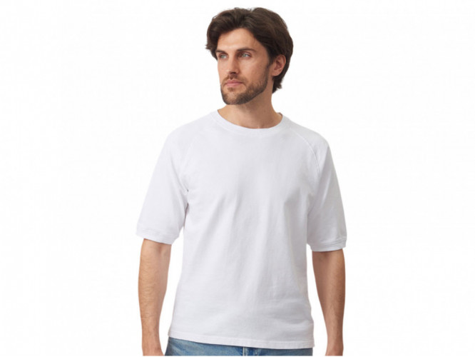 Футболка выполнена из хлопкового френч терри с петельками на изнаночной стороне. Горловина обработана рибом 2х2 и дополнительно усилена тесьмой-елочкой с внутренней стороны спинки и дополнена кокеткой по спинке для нанесения логотипа клиента. Рукав реглан продублирован рибом по низу. Разрезы в боковых швах. Гладкая поверхность полотна позволяет идеально нанести изображение. Футболка комфортного силуэта. - кокетка на внутренней стороне спинки для нанесения - комфортный силуэт - мягкое и качественное полотно френч терри