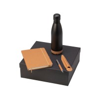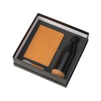 Набор из блокнота, ручки и бутылки для воды - идеальный вариант для подарка сотрудникам или клиентам.Термобутылка имеет медный слой между стенками, который позволяет ей удерживать температуру до 24 часов. Нижняя часть бутылки выполнена из экологичной пробки, которая не даёт скользить по столу или царапать его.Блок блокнота - бежевого цвета с линовкой в линейку. Твёрдая обложка выполнена из переработанной кожи, как и вставка на ручке. Ручка изготовлена из переработанной стали и оснащена стержнем с эко-чернилами, при производстве которых не выделяется вредных веществ.объём термобутылки: 460 мл;блокнот с резинкой;мерч с заботой об экологии.