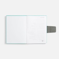 Ежедневник с твердой обложкой, выполнен из материала Nubuck Touch, цвет морской волны II, дополнен капталом, ляссе и обрезом серого цвета. Застежка — хлястик на магните из материала Nubuck Touch, серый СС.