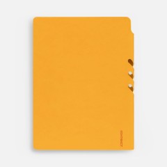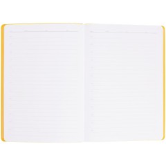 Гибкая обложка выполнена из материала Soft Touch, желтый КК и Latte, желтый КК (внутренняя часть обложки). Внутри корешка — специальное место для крепления ручки размером до 15х1 см.