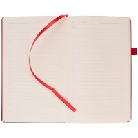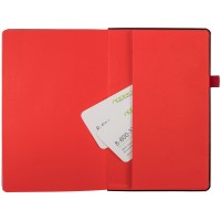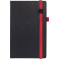 Ежедневник с полутвердой обложкой, выполнен из материала Waltz, черный АА, дополнен красной резинкой с металлическим шильдом и ляссе.