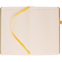 Ежедневник с полутвердой обложкой, выполнен из материала Waltz, черный АА, дополнен желтой резинкой с металлическим шильдом и ляссе.