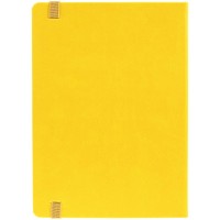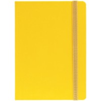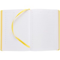 Ежедневник с твердой обложкой, выполнен из материала Latte, желтый КК, обрез зеленого цвета, дополнен резинкой и ляссе желтого цвета.