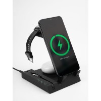 Зарядная станция Tres высшего уровня сложности позволяет заряжать до 5 гаджетов одновременно: телефон, часы Apple Watch 2–8, наушники с поддержкой протокола беспроводной зарядки Quick Charge и еще 2 устройства через кабели с разъемами USB-А и Type-C.