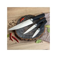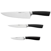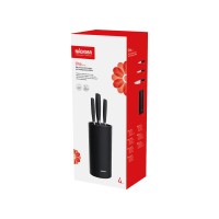 Набор из 3 кухонных ножей в универсальном блоке/- Высококачественная нержавеющая сталь- Лезвие остаётся острым очень долгое время- Кованная ручка из нержавеющей стали с покрытием "Софт-тач"Комплектность:1. Нож для овощей, 9 см2. Нож универсальный, 12,5 см3. Нож поварской, 20 см4. Универсальный блок для ножей