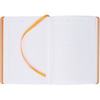 Ежедневник с твердой обложкой, выполнен из материала Latte, оранжевый ОО, обрез оранжевого цвета, дополнен ляссе оранжевого цвета и резинкой с металлическим шильдом.