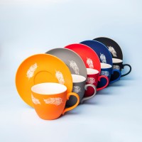 Чайная пара из фарфора с прорезиненным покрытием soft-touchЧашка классической формы и удобное глубокое блюдцеЦвет близкий к,Pantone 1645CНе рекомендуется мыть в посудомоечной машине
