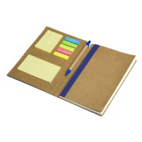 Набор включает в себя разноцветные стикеры разных размеров, блокнот с линованной бумагой и ручку c корпусом из переработанного картона. Обложка выполнена из фактурной искусственной кожи, которая, при тиснении, меняет цвет на более глубокий.