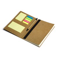 Набор включает в себя разноцветные стикеры разных размеров, блокнот с линованной бумагой и ручку c корпусом из переработанного картона. Обложка выполнена из фактурной искусственной кожи, которая, при тиснении, меняет цвет на более глубокий.