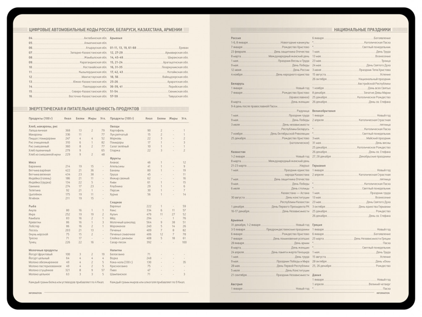 Недатированный ежедневник «Megapolis Flex» от бренда Bruno Visconti - это качественный корпоративный подарок по выгодной цене, произведенный специально под персонализацию. Представлен в универсальном формате А5 и состоит из 272 страниц. Элегантная закругленная flex обложка из гладкого кожзама имеет гибкую конструкцию и приятна на ощупь. А интегральный переплет позволяет сэкономить место в деловой сумке или портфеле – ежедневник можно просто свернуть в трубку или согнуть пополам. В ежедневнике «Megapolis Flex» есть полезная справочная информация и телефонная книга, а также страницы для записи идей, мыслей и составления рабочих планов. Для изготовления страниц используется качественный бежевый офсет повышенной плотности (70 г/кв м). Блок не привязан к конкретным датам – они указываются в выделенном поле вверху страницы. Тонированная бумага не дает глазам утомиться даже при длительной работе. Все ежедневники от бренда Bruno Visconti можно персонализировать с помощью тиснения обложки - золотой или серебряной фольгой. Наши ежедневники помогут быть успешным и эффективным в карьере и повседневной жизни!