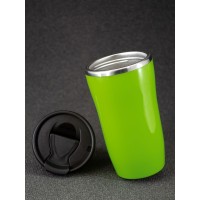 Двухслойная конструкция из пластика снаружи и пищевой нержавеющей стали внутри. Герметичная завинчивающаяся крышка с откидным клапаном для питья. В отверстие в крышке можно вставить шнурок для удобного ношения стакана на руке. Шнурок в комплект не входит.