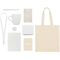 - материал: шоппер- 100% хлопок, блокнот и чехол- искусственная кожа, ручка и держатель- пластик, кружка- керамика, ланъярд- RPET, открытка- бумага