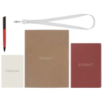 Материал товара блокнот - искусственная кожа, открытка - бумага, пакет - картон, ручка - пластик с покрытием soft-touch, ланьярд с ретрактором - полиэстер, металл, пластик.