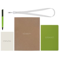 Материал товара блокнот - искусственная кожа, открытка - бумага, пакет - картон, ручка - пластик с покрытием soft-touch, ланьярд с ретрактором - полиэстер, металл, пластик.