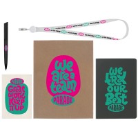 Материал блокнот - искусственная кожа, открытка - бумага, пакет - картон, ручка - пластик с покрытием soft-touch, ланьярд с ретрактором - полиэстер, металл, пластик.