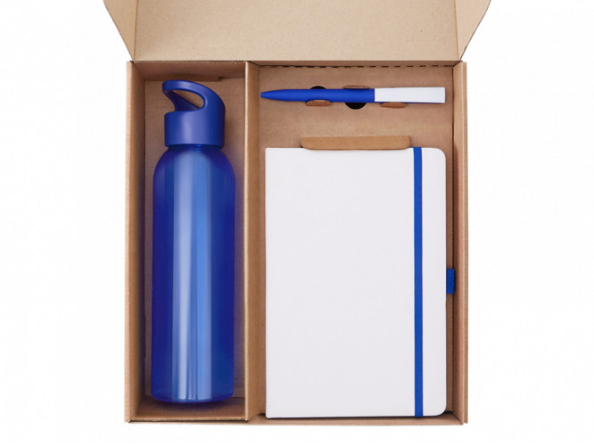 - материал: бутылка -поликарбонат, блокнот - искусственная кожа, бумага, ручка - пластик с покрытием soft-touch, держатель - пластик, ланчбокс - пластик, открытка - картон, коробка - картон