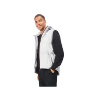 Утепленный жилет для мужчин*центральная молния контрастного цвета*два боковых кармана застегиваются на молнию*большой внутренний карман для документов или денег*контрастная внутренняя подкладка*эластичная кулиска с фиксаторами по низу изделия*задняя часть жилета длиннее передней*съемный капюшон*утеплитель 260гр и в капюшоне 200гр