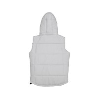 Утепленный жилет для мужчин*центральная молния контрастного цвета*два боковых кармана застегиваются на молнию*большой внутренний карман для документов или денег*контрастная внутренняя подкладка*эластичная кулиска с фиксаторами по низу изделия*задняя часть жилета длиннее передней*съемный капюшон*утеплитель 260гр и в капюшоне 200гр