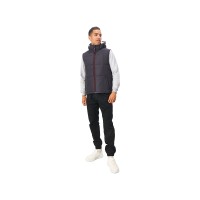 Утепленный жилет для мужчин*центральная молния контрастного цвета*два боковых кармана застегиваются на молнию*большой внутренний карман для документов или денег*контрастная внутренняя подкладка*эластичная кулиска с фиксаторами по низу изделия*задняя часть жилета длиннее передней*съемный капюшон*утеплитель 260гр и в капюшоне 200гр