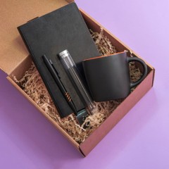 Описание Набор подарочный DESKTOP: кружка, ежедневник, ручка, стружка, коробка, черный/оранжевый