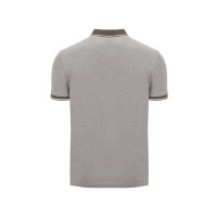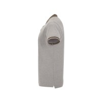 Рубашка поло с коротким рукавом. Манжеты и воротник из однотонного риба 1х1 с контрастными полосками. Планка на 3 пуговицы. Низ с боковыми разрезами, отделанными тесьмой. Спинка немного длиннее полочки. Полотно с меланжевым эффектом.