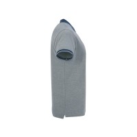 Рубашка поло с коротким рукавом. Манжеты и воротник из однотонного риба 1х1 с контрастными полосками. Планка на 3 пуговицы. Низ с боковыми разрезами, отделанными тесьмой. Спинка немного длиннее полочки. Полотно с меланжевым эффектом.