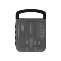 Набор инструментов в удобном пластиковом кейсе, состоит из 6 инструментов и 16 насадок:- Плоскогубцы- Отвертка с удлиннителем- 2 шестигранника- 2 тонких отвертки- 6 головок гаечных торцевых ключей (6/7/8/9/10 мм)- 9 бит + адаптер