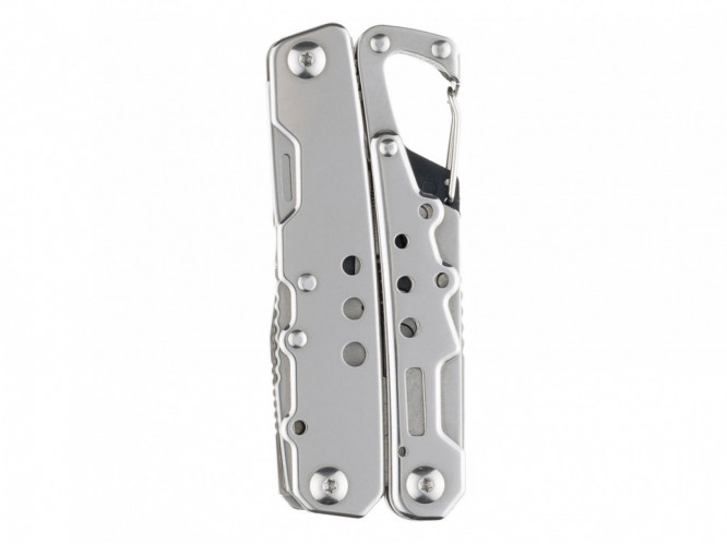 Нож перочинный STINGER имеет 9 функций: 1. Лезвие с фиксатором клинка Liner Lock 2. Ножницы 3. Пила 4. Лезвие с серрейторной заточкой 5. Открывалка для бутылок 6. Консервный нож 7. Инструмент для снятия изоляции 8. Стеклобой 9. Клип ХАРАКТЕРИСТИКИ Материалы • лезвие/инструменты: нержавеющая сталь 440A, твердость 54-58 HRC • рукоять: нержавеющая сталь 440A, твердость 54-58 HRC Размеры • Размеры ножа: 112х20х25 мм • Общая длина: 185,5 мм • Длина клинка: 79,3 мм • Наибольшая ширина клинка: 17 мм • Толщина обуха: 2,5 мм • Длина рукояти: 111,3 мм • Ширина рукояти (в ср.части): 19,4 мм • Толщина рукояти (в ср.части): 18,9 мм Вес: 141 г Цвет: серебристый Упаковка: картонная коробка
